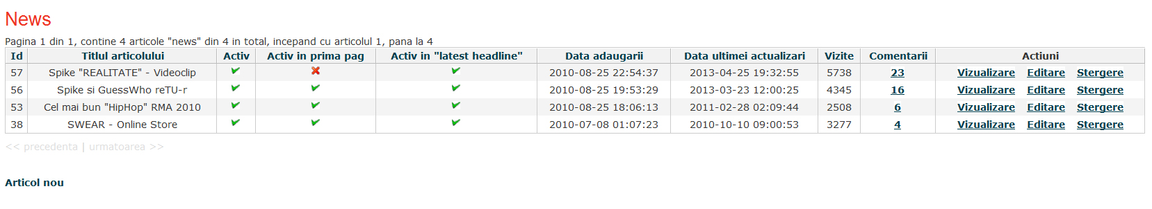 http://spike-store.desertdesign.ro/Site de prezentare complex, cu panou de administrare - programat pe framework-ul CakePHP. Include o multitudine de facilitati, o comunitate online si posibilitatea de a fi la curent cu noutatile artistului. Site-ul oficial nu mai este disponibil online, insa il puteti vizita pe serverul nostru in varianta demonstrativa:
